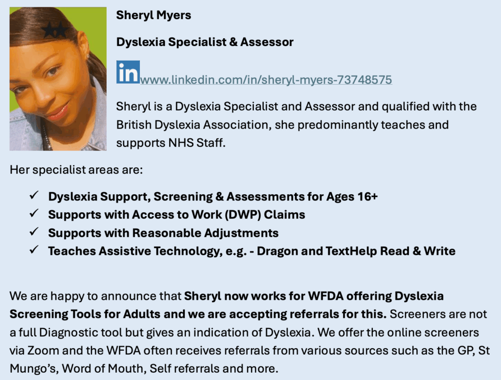 Simply email us at admin@wfda.org.uk with your queries and/or referrals using the subject title ‘Dyslexia Screening Query’ and let us discuss the next steps in receiving the support that you deserve. Alternatively, you can call us on 020 8520 7370.